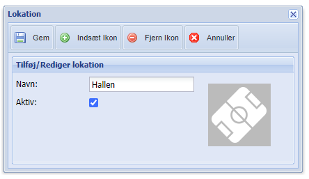 Udfyld navn på lokation og sæt kryds om den skal være aktiv. Du kan tilføje et billede/ikon under “Indsæt ikon”.