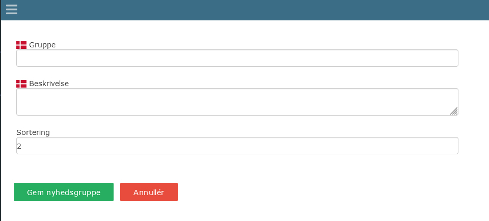 Når du opretter en nyhedsgruppe, skal du den have et navn og en beskrivelse. Sortering kan du bruge til at prioritere hvilken gruppe som skal lægge øverst.