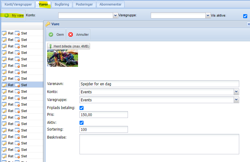 Når dette er gjort skal der oprettes varer. Gå ind under næste fane “Varer” og klik “Ny vare”. Nu kan du oprette en vare med billede, navn samt pris. Derudover skal du tilknytte en konto og varegruppe, gøre den aktiv og beslutte om det skal være relevant med friplads betaling.